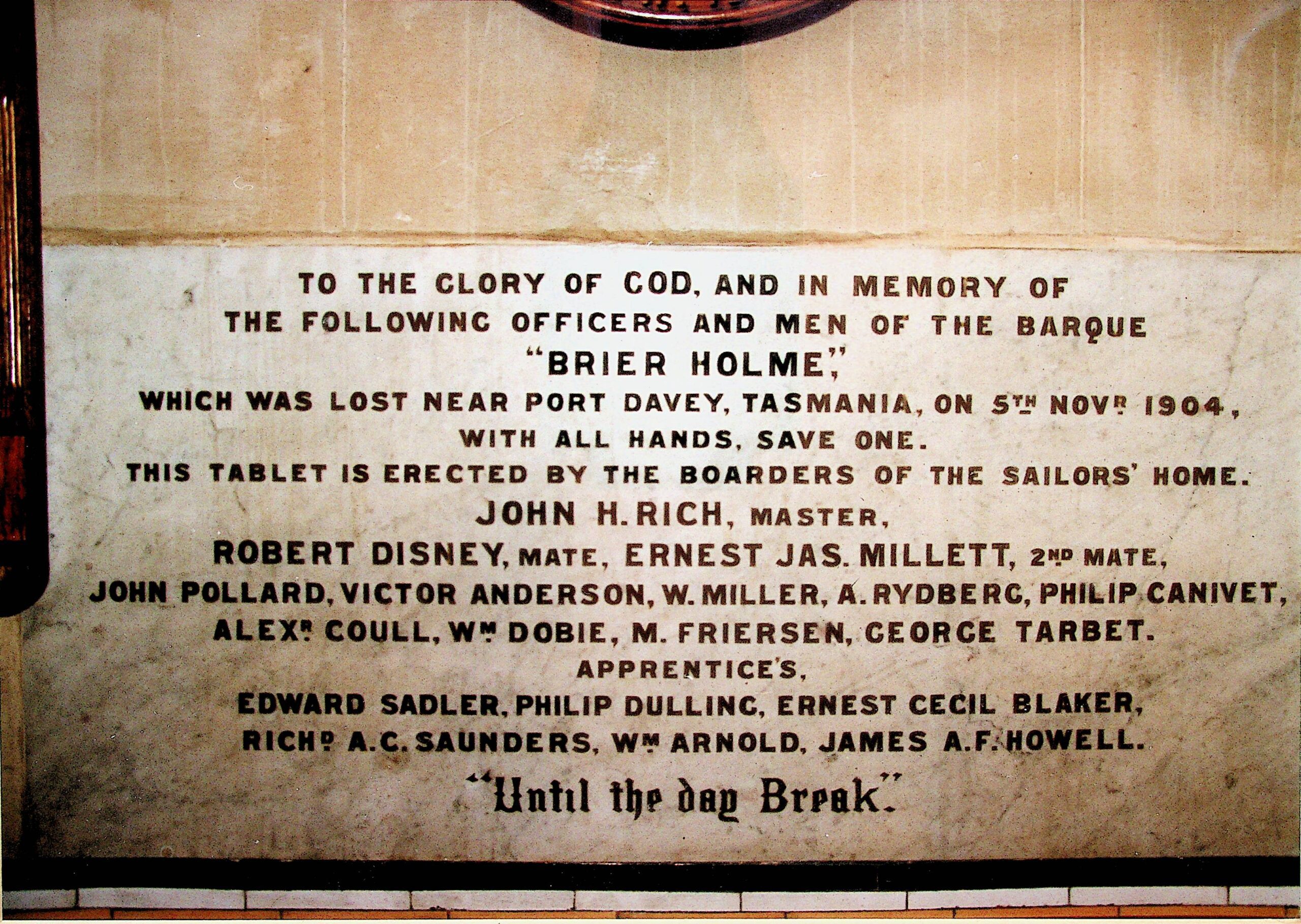 The Brier Holme set sail from London on 21 July 1904 with a crew of 18 under the command of Captain John H. Rich of Maryport who then lived in Church Street, Maryport, having previously lived at 6 North Street. Bound for Tasmanian ports, the ship’s passage had been slowed by adverse winds until she rounded the Cape of Good Hope, after which she made good progress. When 107 days out from London, off Western Tasmania the ship ran into heavy weather with mountainous seas, the ship hove to, but just before midnight on 5 November 1904 the Brier Holme was driven onto the rocks at Elliott’s Cove. As soon as the vessel struck, the dynamite, which formed part of her cargo, exploded and it was though that the captain and some of the crew were killed immediately. The rest climbed onto the rigging because the lifeboats had been carried away, but when the ship broke up and the masts went, they all drowned, except one, Oscar Larsen. Oscar Larsen was a Norwegian seaman and the sole survivor. He lived on supplies washed ashore from the wreck on an uninhabited part of the island until he was rescued in February 1905.