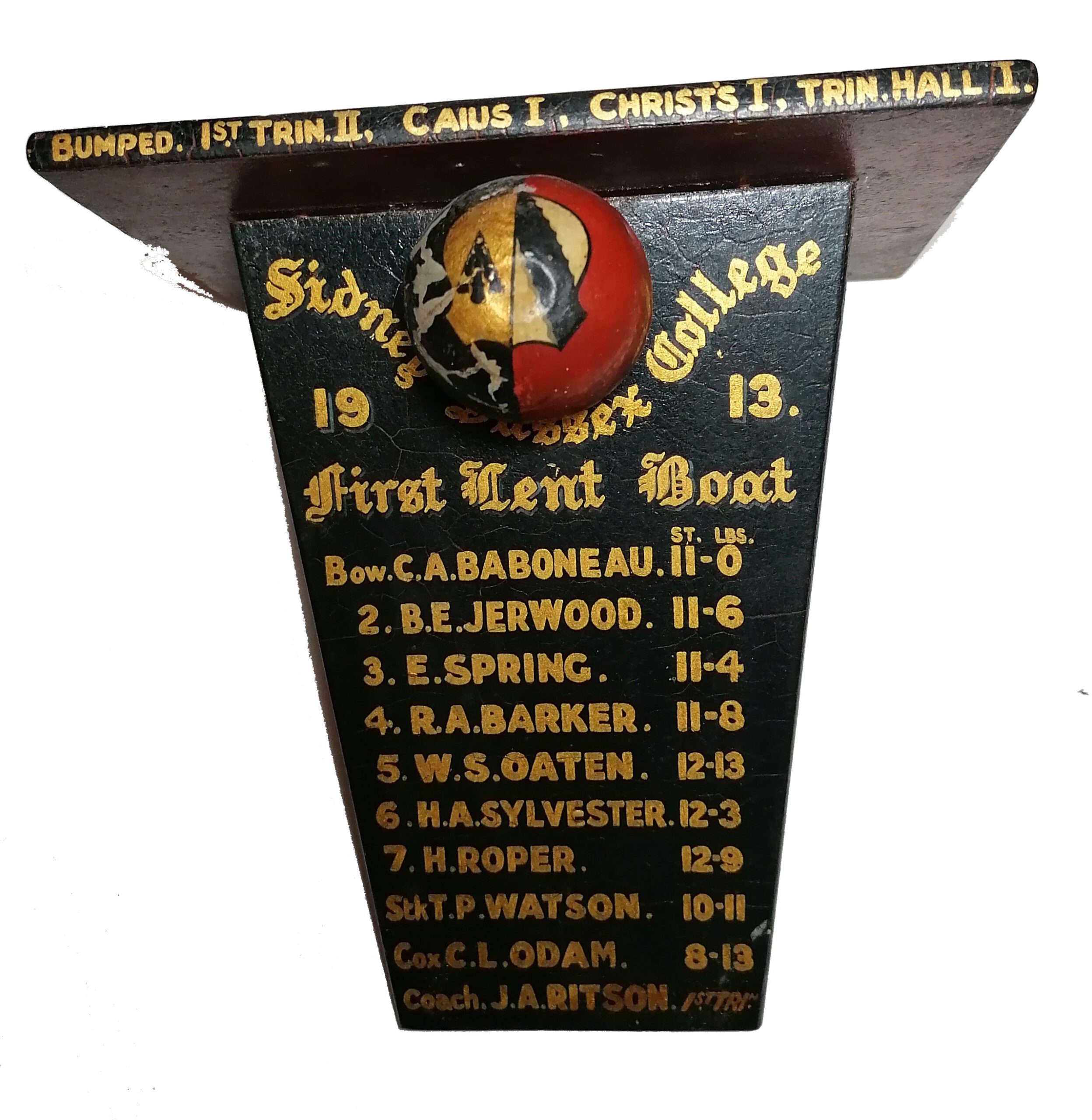 John Andrew Ritson was the great grandson of John Ritson; a shipbuilder from Maryport. The only son of Robert Ritson, surgeon of Blandford House, Reading and Molly Ritson he was educated at Rugby School before going to Trinity College, Cambridge. While at Cambridge he rowed for First Trinity and helped to win the Ladies Plate in Henley in 1913. In 1914 he was selected to row number four at the annual Boat Race between the two universities, the last one before the outbreak of the First World War. John was killed in action at the Battle of the Somme in the early hours of 23 July 1916, age 23 and is buried in Caterpillar Valley Cemetery, Longueval, Somme, plot VI. F. 21. He is also commemorated at Rugby School and at Trinity College Chapel in Cambridge.